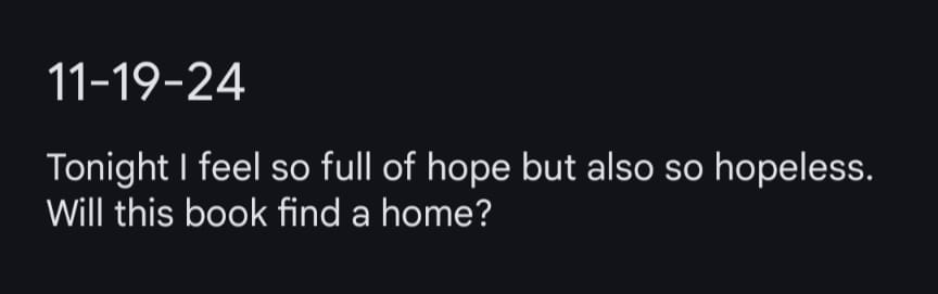On the night of November 19th, I was feeling particularly emotional about my novel. I’d just finished reading an ARC of the amazing book, The Artist of Blackberry Grange by Paulette Kennedy (which can be preordered here). Like my book, it focused on the protagonist’s relationship with an elderly family member, and it made me wonder if I’d get a chance to share my story. And so, my emo self wrote this in my Notes app: